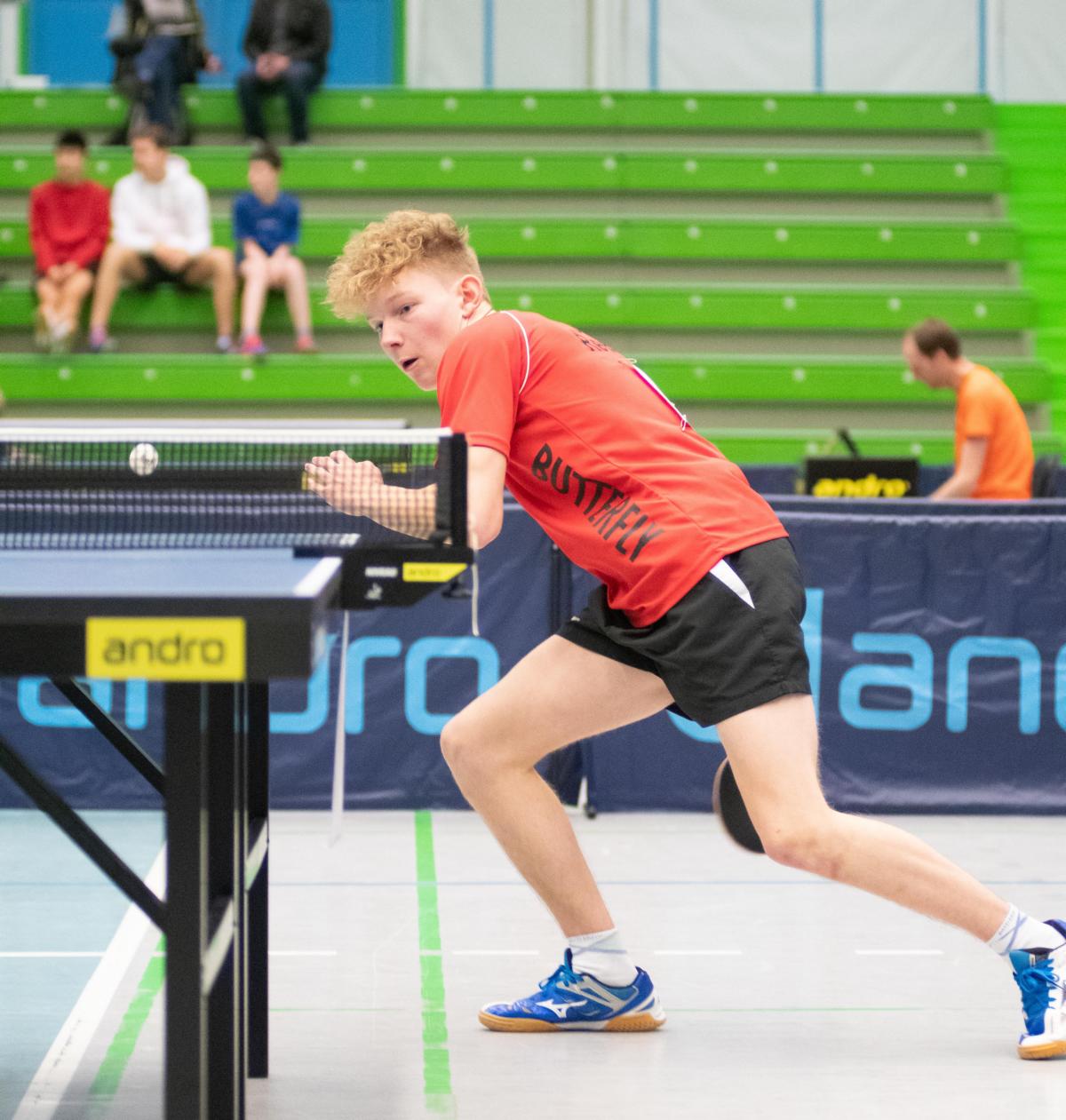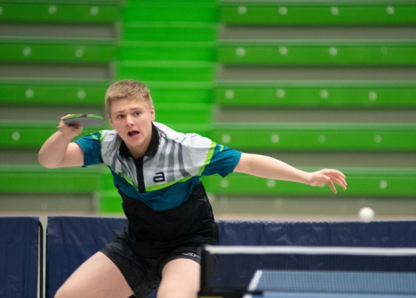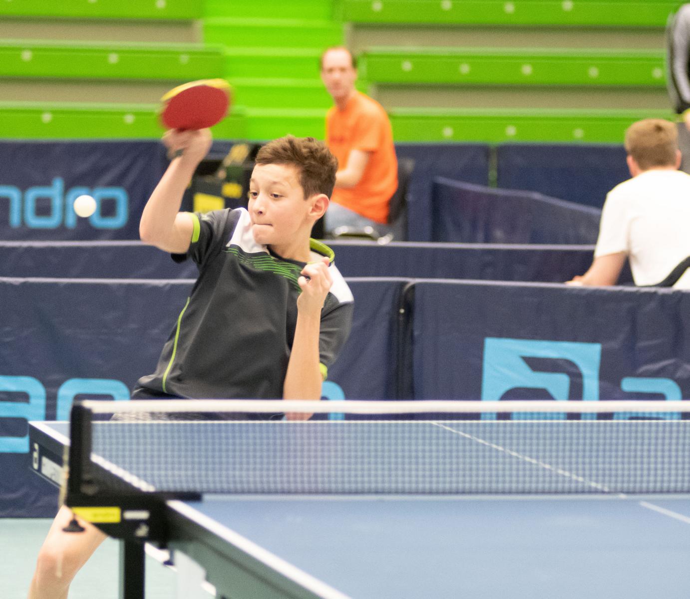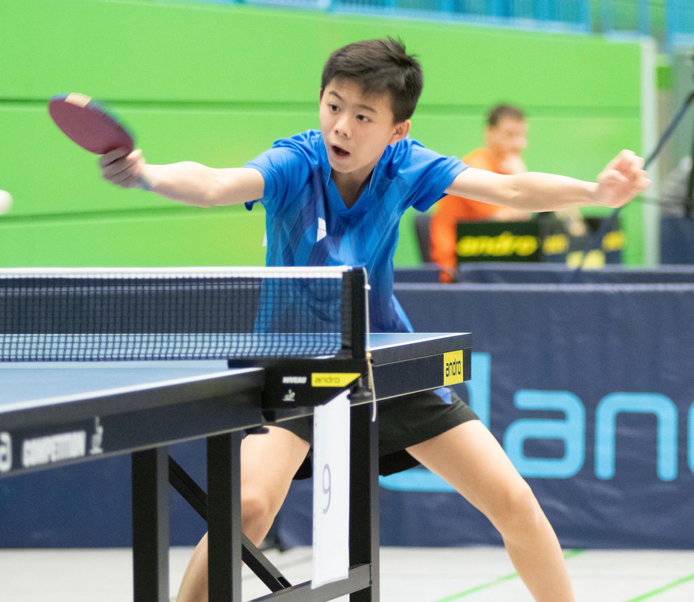 Bei den Jungen zeigte sich das selbe Bild. Auch hier standen die besten vier Jungen laut Setzliste auch im Halbfinale. Lukas Bosbach traf auf Raphael Schapiro (Borussia Düsseldorf). Hier überstand Lukas nach dem 1:1-Satzausgleich und Satzball gegen sich die etwas knifflige Situation, siegte im dritten Satz mit 13:11 und am Ende dann mit 3:1. Sein Gievenbecker Vereinskamerad Tim Artarov, der vor allem am Samstag ein paar knappe Situationen überstehen musste, hatte im zweiten Halbfinale gegen Guo Jiaxing (Borusia Düsseldorf) allerdings keine Chance und musste nach einem deutlichen 0:3 dem Düsseldorfer gratulieren.