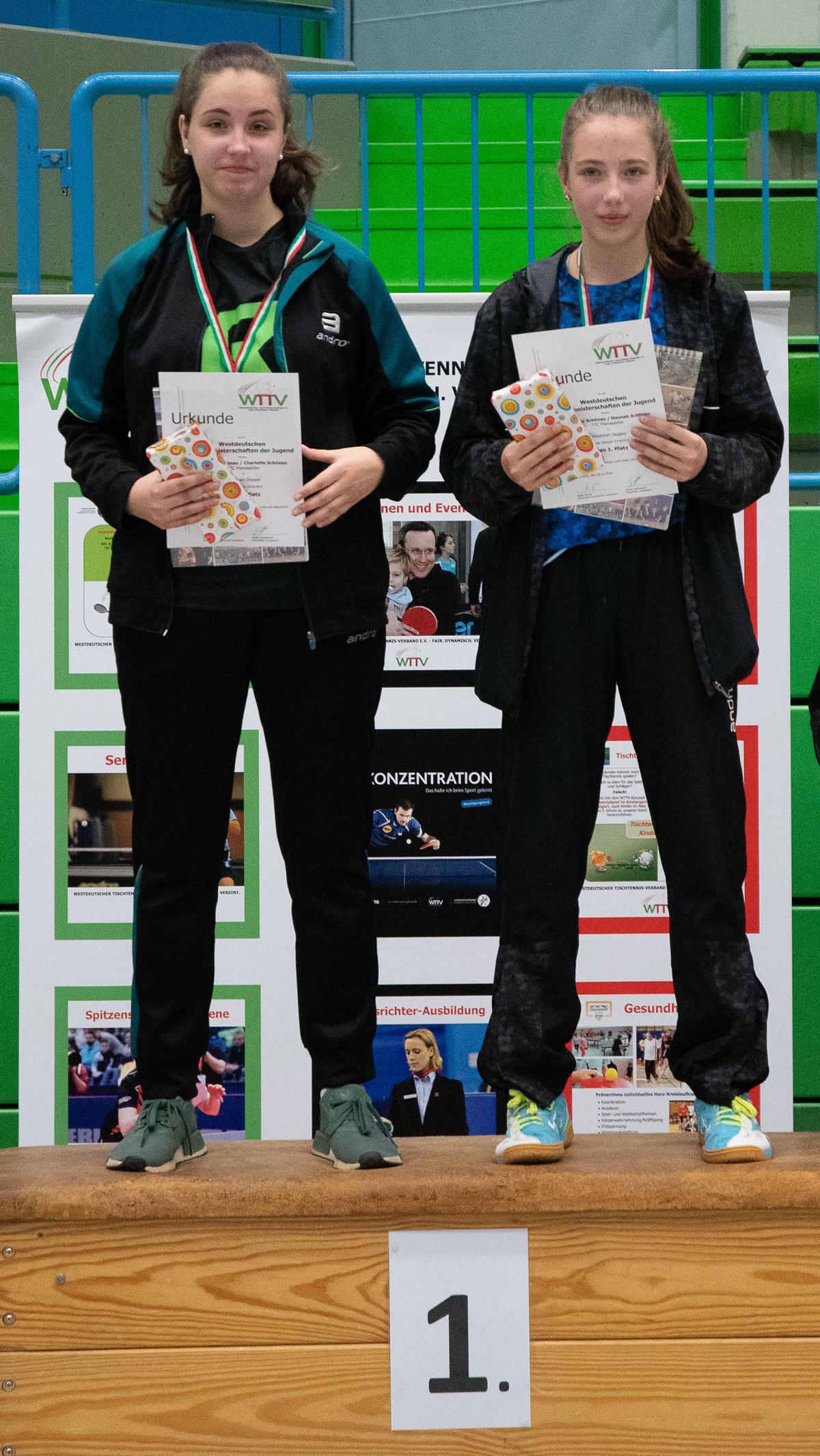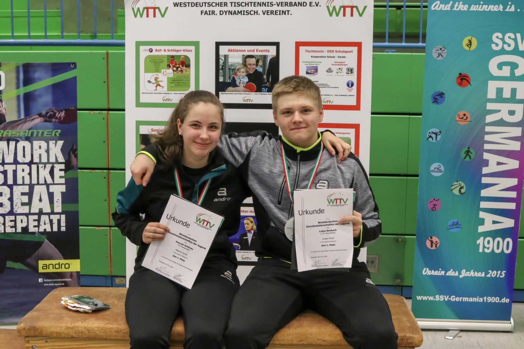 Bei den Westdeutschen Jugend-Einzelmeisterschaften in Wuppertal siegten die Favoriten. Hannah Schönau (TTC Mariaweiler) und Lukas Bosbach (1. FC Gievenbeck) fuhren mit jeweils zwei Siegen im Gepäck nach Hause. Beide bestätigten im Einzel ihre Topsetzung und siegten auch im Doppel.