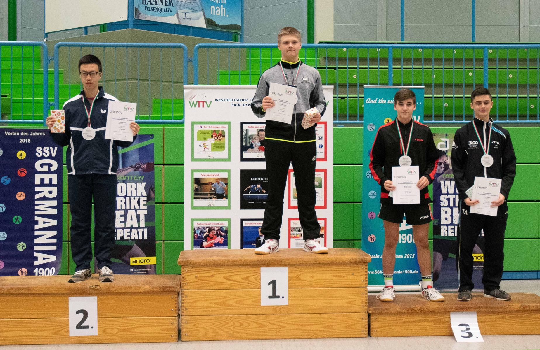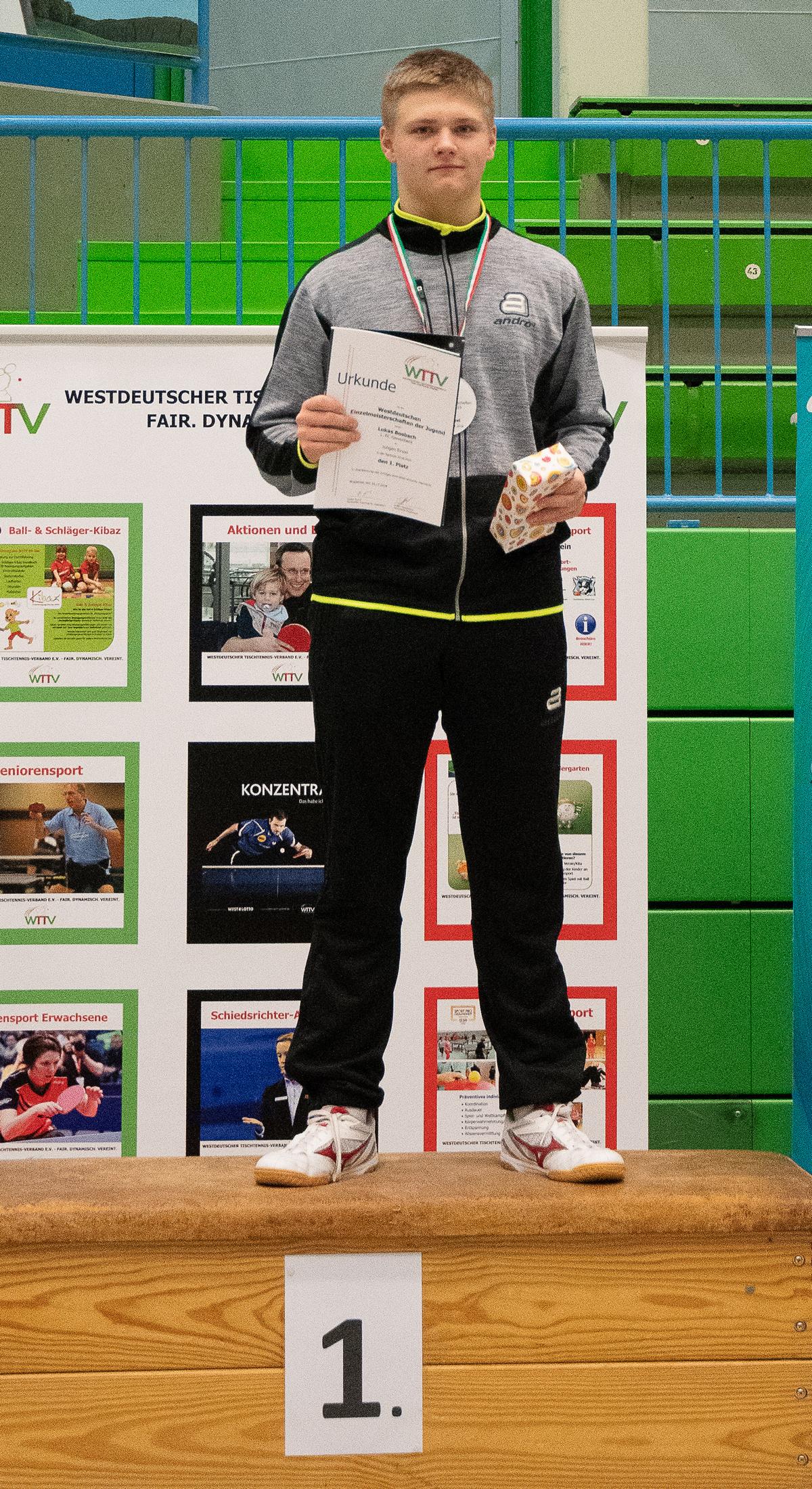 Auch das Finale verlief dann sehr einseitig. Guo Jiaxing hatte mit den präzisen Spinbällen von Lukas Probleme. Dieser machte wenig Fehler und holte sich nach einem deutlichen 3:0-Sieg verdient den Titel des Westdeutschen Meisters. Wie souverän Lukas an diesem Wochenende agierte, zeigt auch, dass er im gesamten Turnier lediglich zwei Sätze abgegeben hat. „Mein Ziel war ganz klar der Turniersieg. Ich freue mich sehr darüber, dass ich meine Leistung abrufen konnte und mein Ziel erreicht habe“, so der glückliche Sieger.