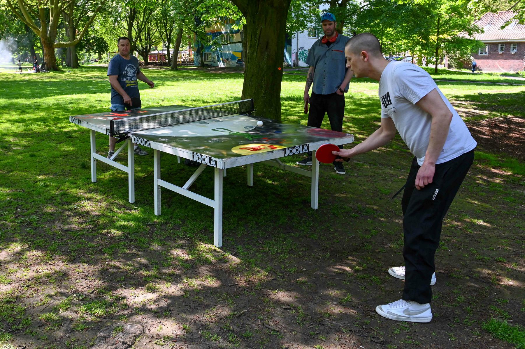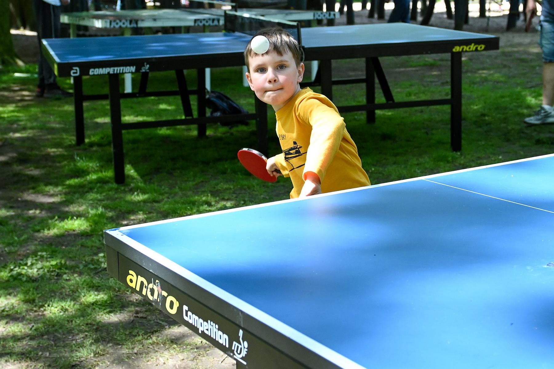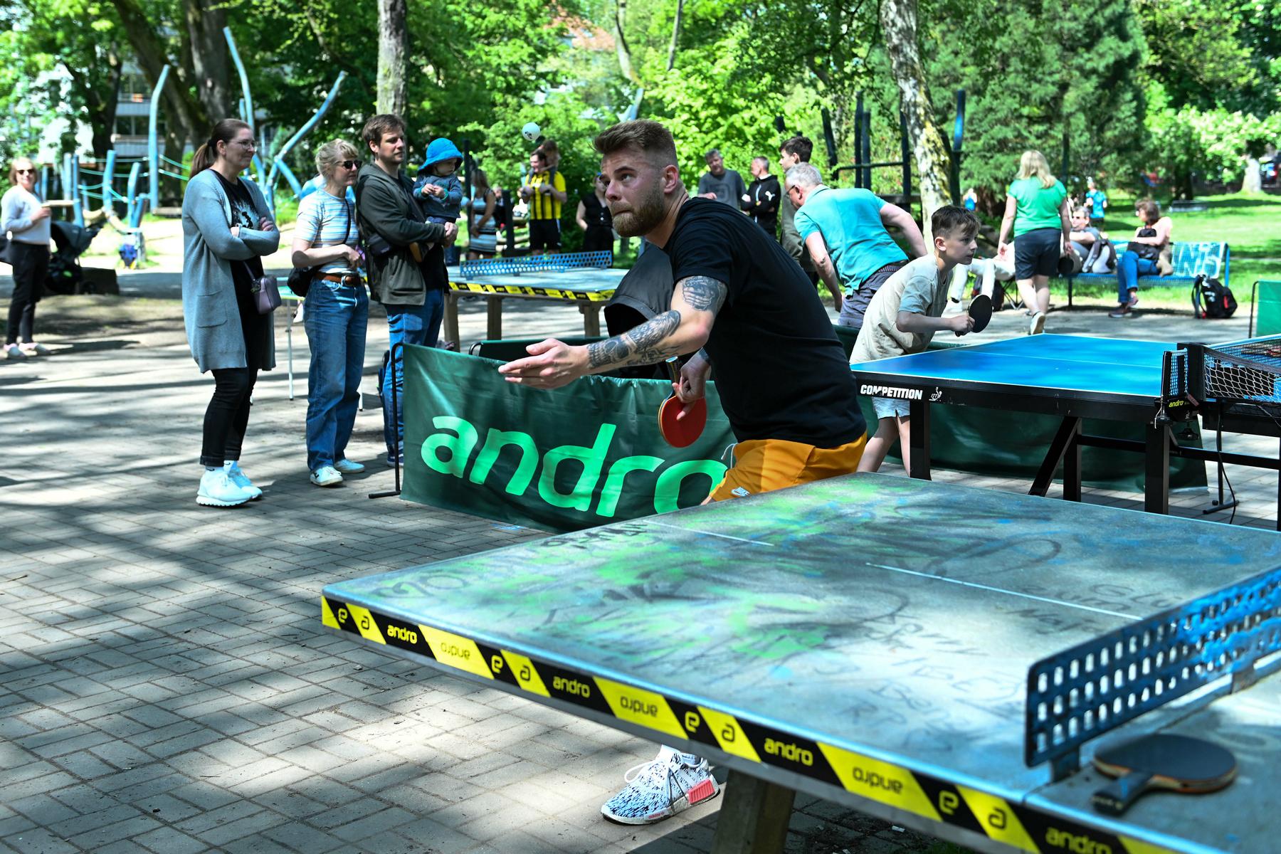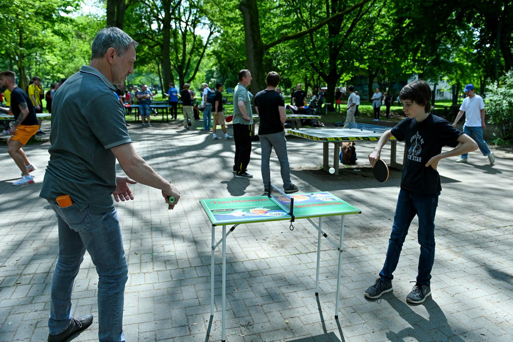 Neben den vier Stein Tischtennistischen, die im Park stehen, wurden weitere Turniertische, Miditische und ein Tisch mit einem Ballroboter zum Spielen bereit gestellt. An allen Tischen wurde stets gespielt und besonders der Ballroboter war zwischen den Turnieren das Ziel von Groß und Klein, wenn kein andrer Tisch frei war. Eine tolle Sache für alle, die dabei waren und ein hervorragende Werbung für unsere geliebte Sportart.