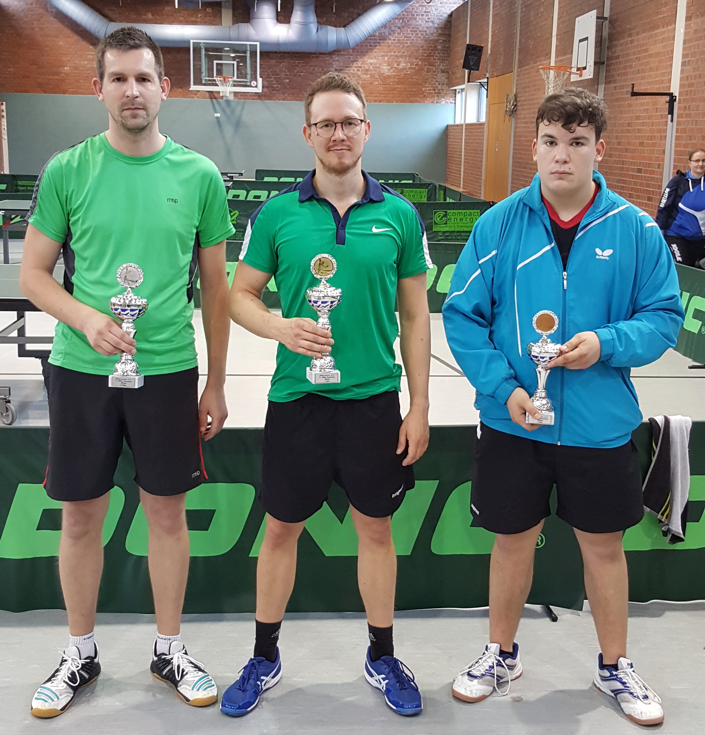 Bei den Herren musste der Favorit Daniel Stein vom TTC Lechenich seine Teilnahme absagen. Für ihn rückte Tim Kaminski noch in das Teilnehmerfeld und gewann das spannende Turnier vor dem Überraschungszweiten Tom Kreuzer vom TV Kall und Sebastian Schog von der SG Erftstadt. Auf den weiteren Plätzen folgten Thomas Müller (TTC Lechenich), Adrian Azemi (SG Erftstadt) und Fabian Gilli (TTC Lechenich).