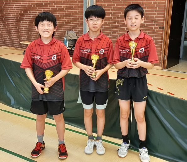 Herzlichen Glückwunsch: Die Jungen 13 der TG Neuss sind Mannschaftsmeister 2025 am Niederrhein! Philipp Fu, Nico Yang und Lewin Fu (auf dem Foto von links) entschieden das Finalturnier in Anrath für sich.