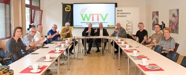 Zur Vertragsunterzeichnung in Duisburg kamen die Mitglieder des WTTV-Präsidiums sowie die hauptamtlichen Mitarbeiter zusammen, um gemeinsam mit Thomas Brosig auf eine erfolgreiche Zukunft anzustoßen.