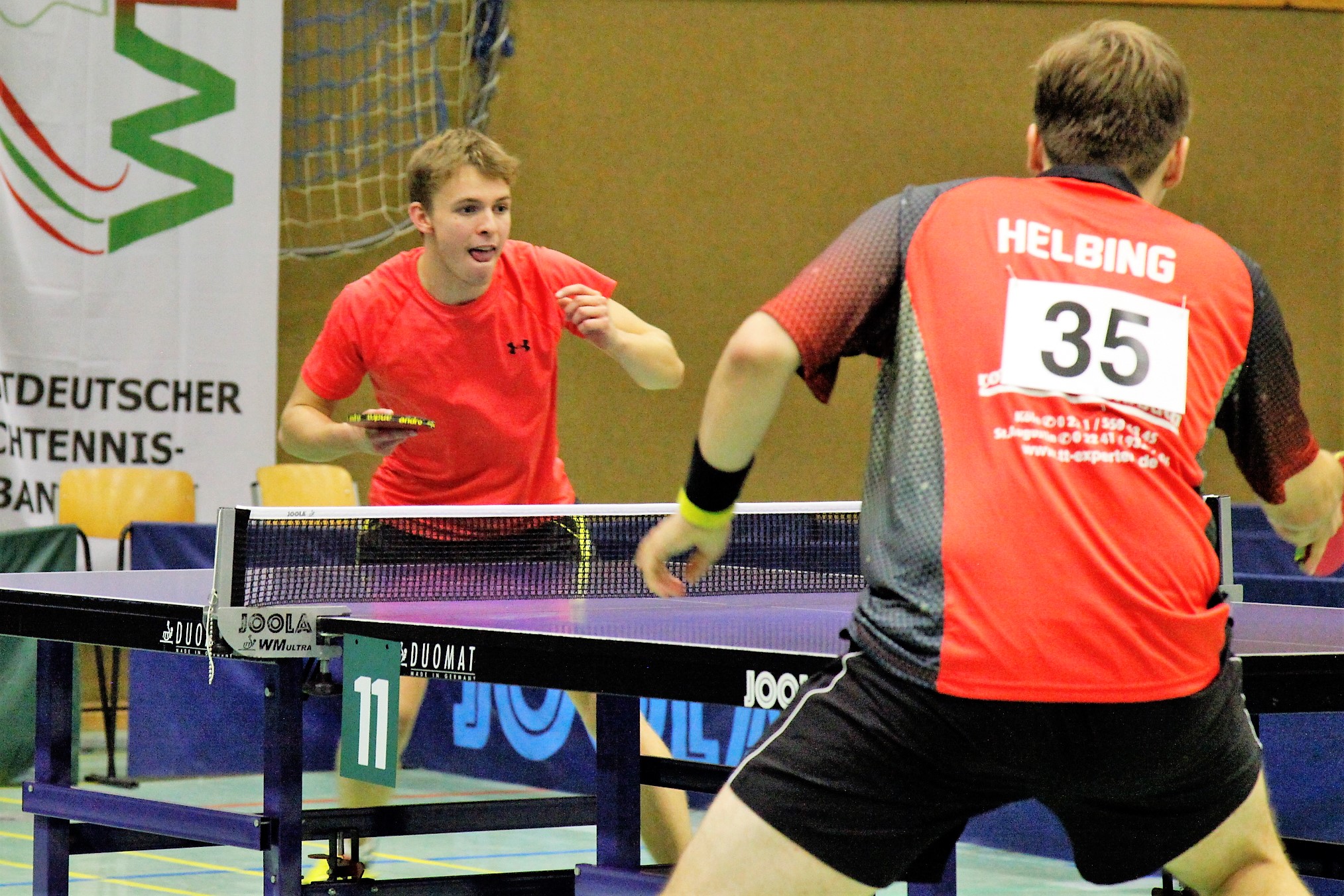 Bei den Herren waren in den Halbfinalspielen die Favoriten unter sich. Im vereinsinternen Duell traf Zweitligaspieler Robin Malessa auf Björn Helbing. Und zunächst sah es nach einer sicheren Sache für Malessa aus. Er dominierte das Spiel, führte schnell 2:0 nach Sätzen und schien auch noch Reserven zu haben. Doch Helbing kam langsam aber sicher auf Hochtouren. Fast alle langen Ballwechsel gingen an ihn und immer wieder konnte er sich auch aus Drucksituationen befreien und den Punkt machen. Im Entscheidungssatz schien Malessa sein Pulver verschossen zu haben. Helbing gewann ihn überlegen.