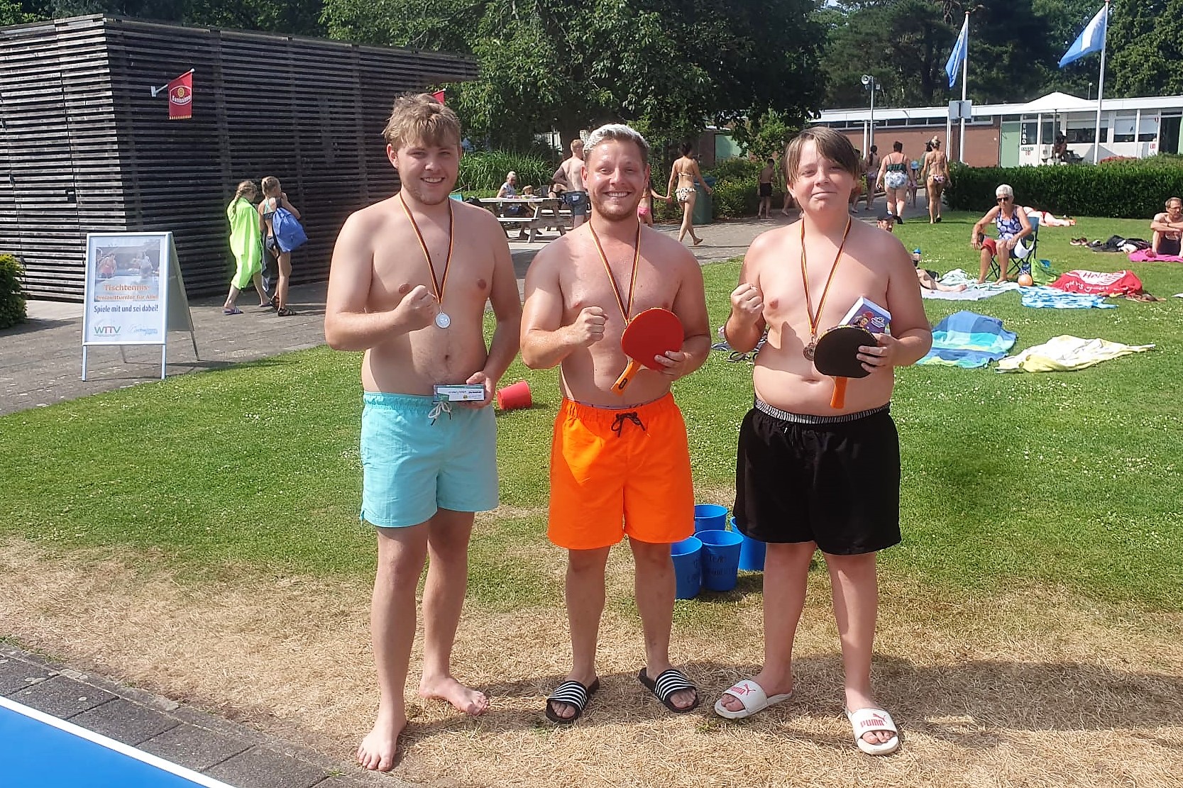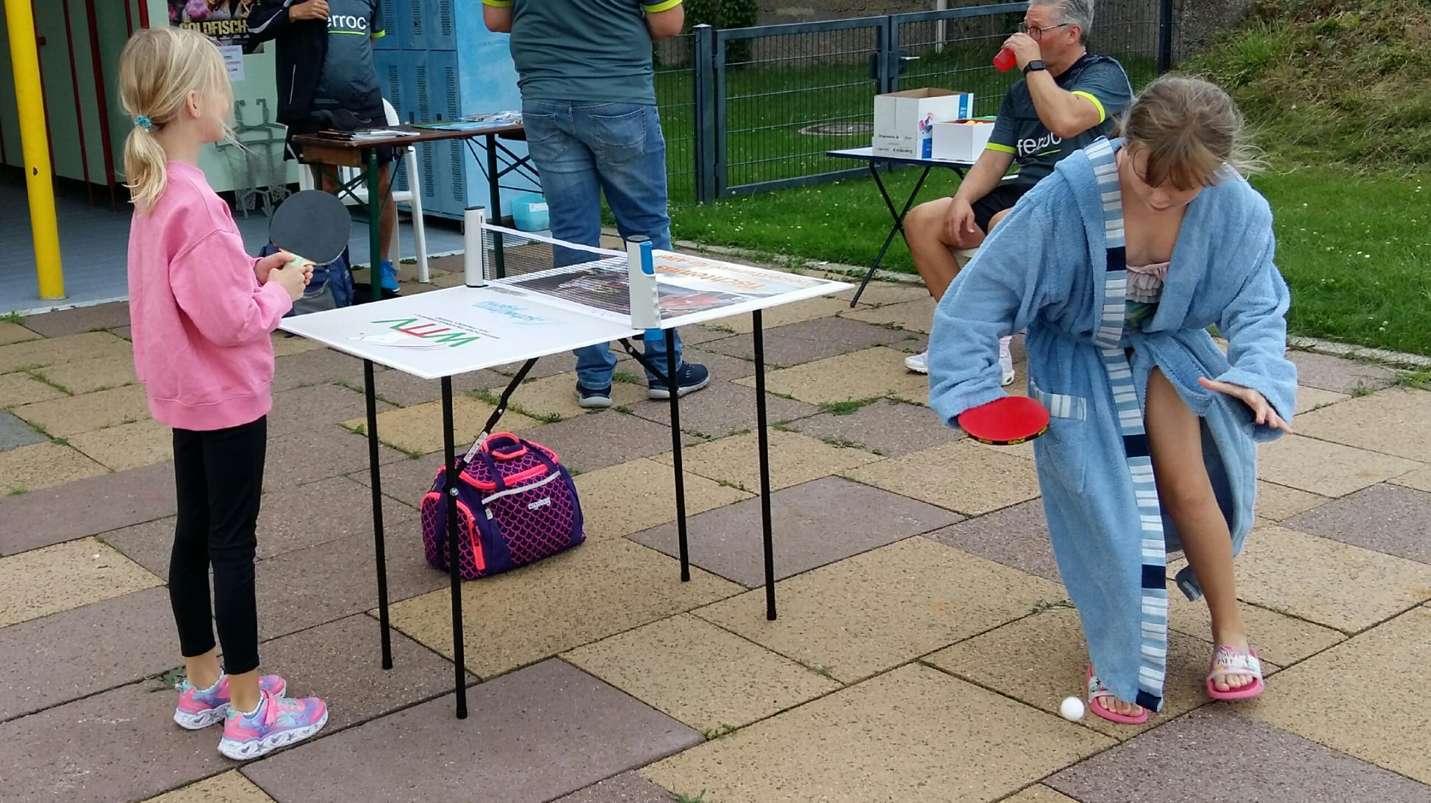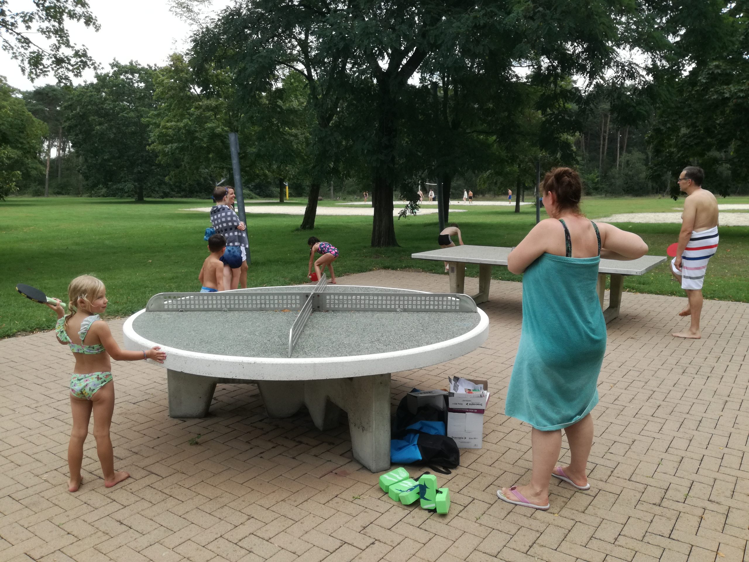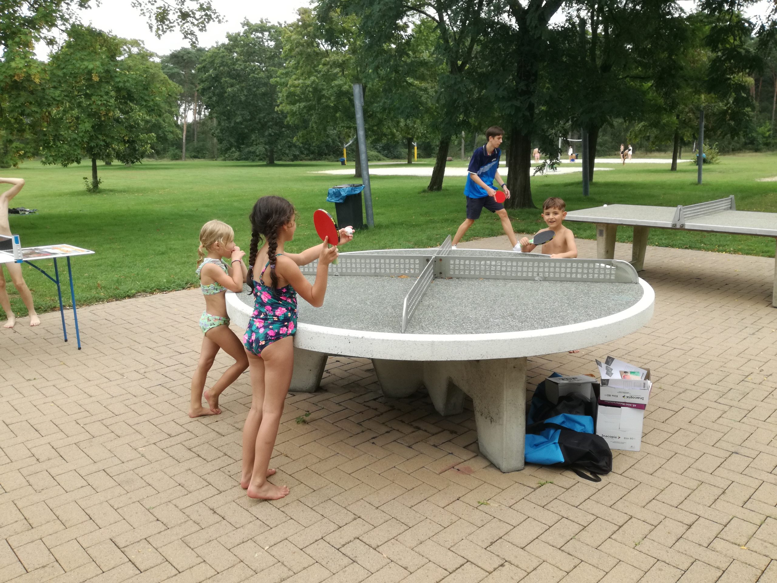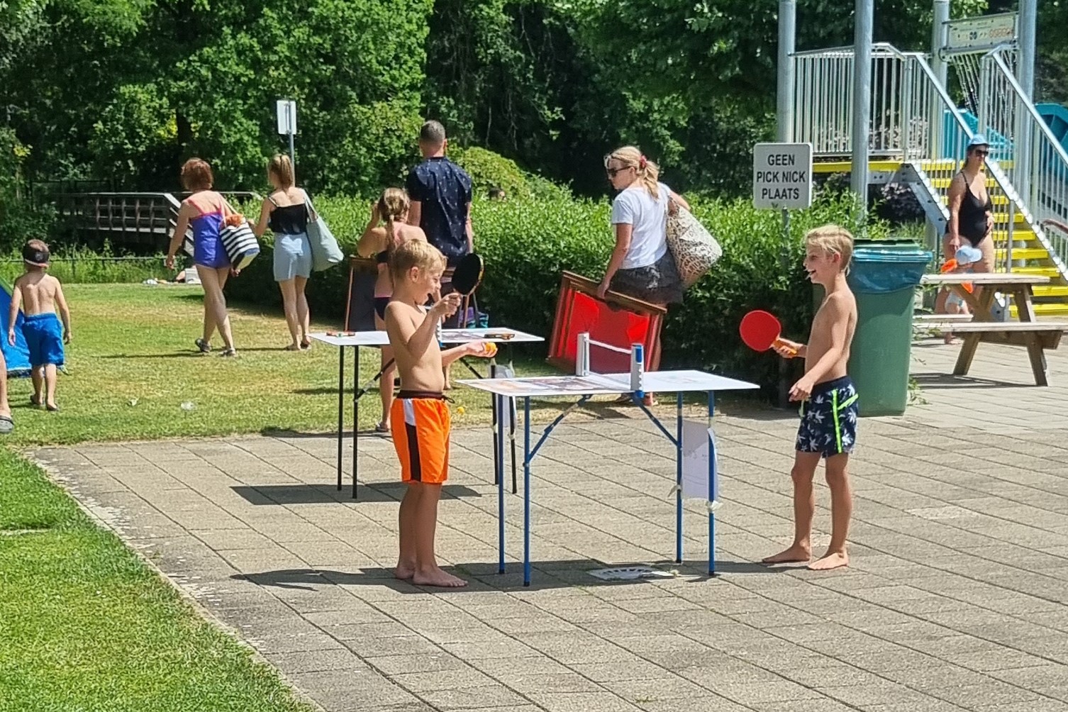 Wieso im Nachbarland? Der Grund ist einfach: Der Freiwilligendienstler des Kreises Mönchengladbach, wohnhaft in Brüggen, führte als Projekt in seiner Dienstzeit den Schwimmbad-Cup durch. Und das nächstgelegene Freibad ist das in der Partnergemeinde Swalmen, direkt an der Grenze gelegen. Partnervereine sollten die TuRa Brüggen und Destatec Swalmen sein – beide Vereine hätten sich toll präsentieren können, waren letztlich aber nicht aktiv. So blieb dann alles beim FSJler hängen, der die Veranstaltung aber bei tollem Wetter und proppevollem Freibad gut über die Bühne brachte. Eine echte Werbung für den Tischtennissport.