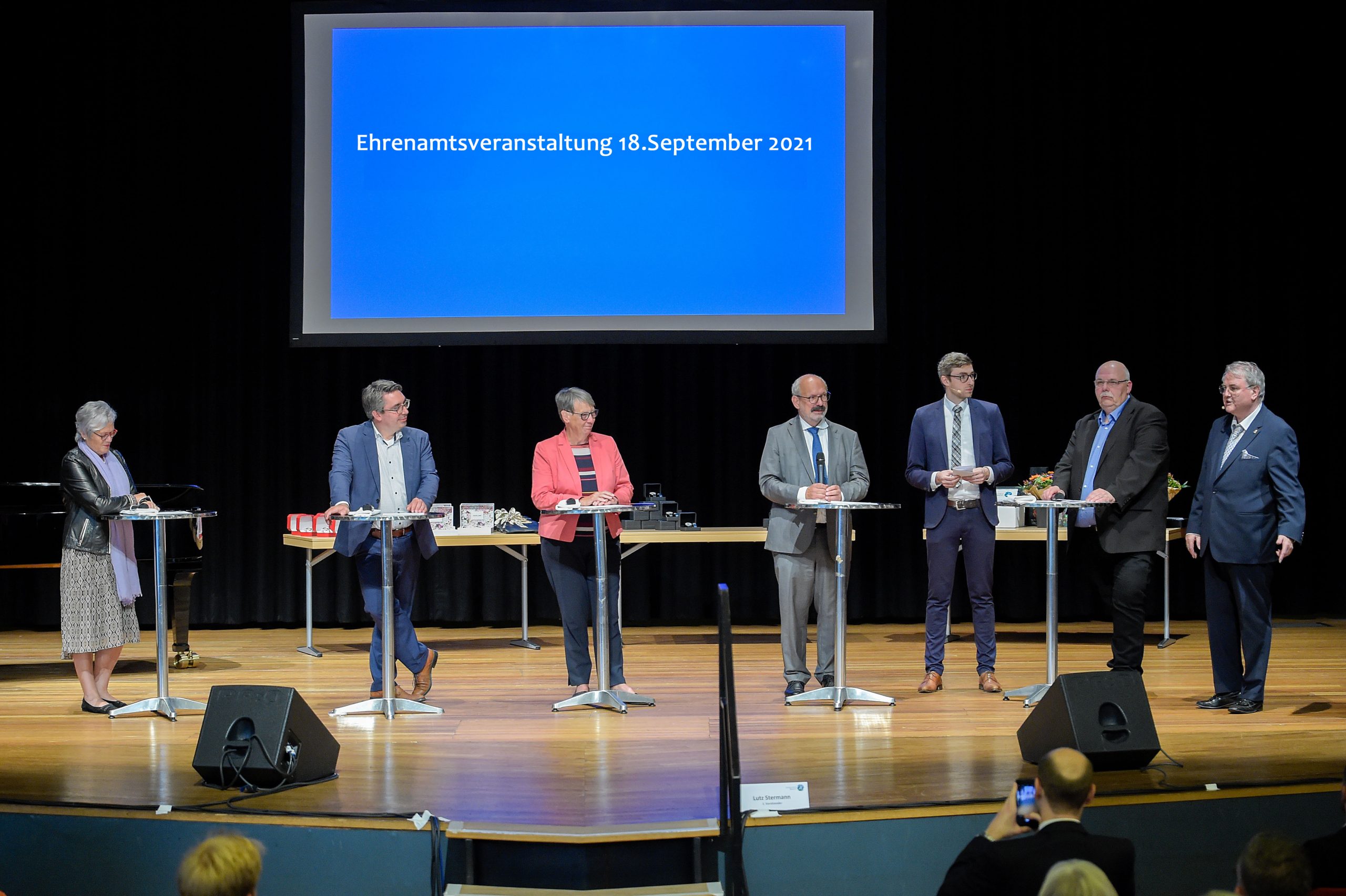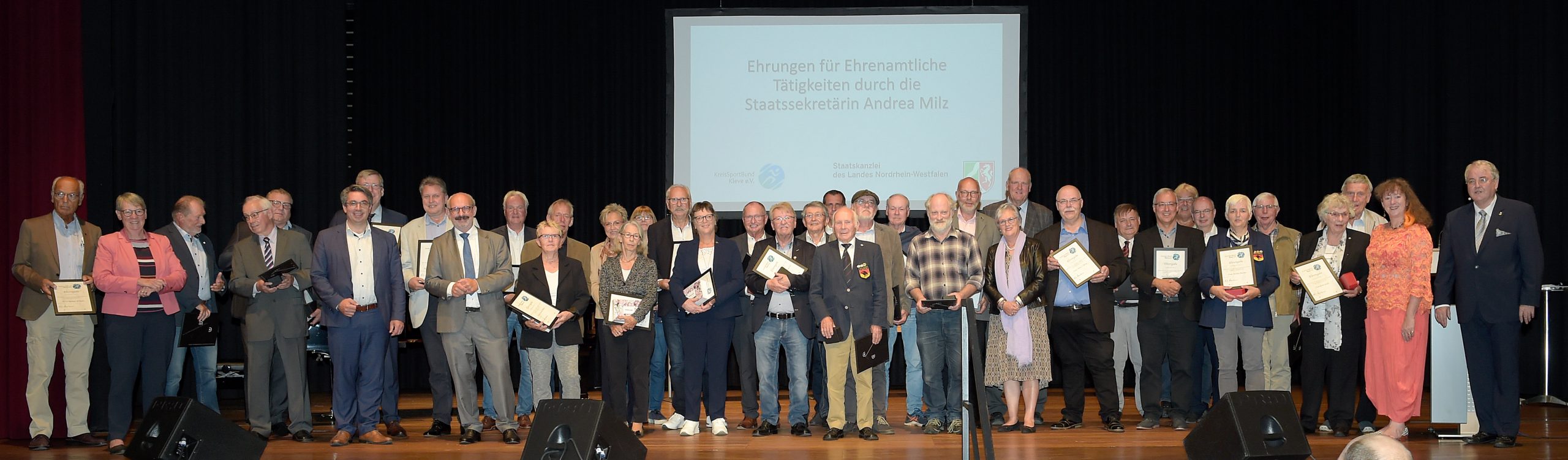 - Die von der Staatskanzlei NRW geehrten Ehrenamtler des WTTV: Helmut Joosten -Rees-, Staatssekretärin Andrea Milz, Klaus Verburg -Kleve-, Heinz Leuken -Geldern-, Hans-Peter Bause –Kleve und Helmut Vehreschild -Kleve-