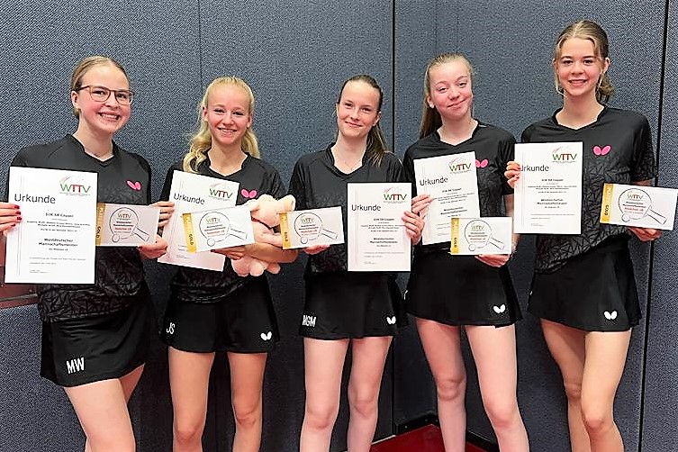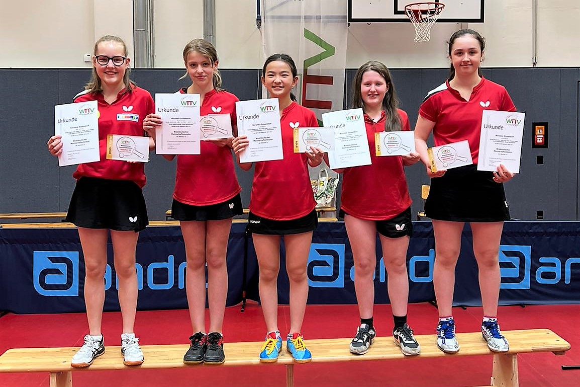 Los ging es am Samstag mit der U15-Konkurrenz. Bei den Mädchen gingen die Teams von Borussia Düsseldorf, LTV Lippstadt, TTC Mennighüffen und die DJK VfL Billerbeck an den Start. Den Titel holte sich ganz souverän Borussia Düsseldorf. Das Team mit Eireen Kalaitzidou, Rhea Zu Chen, Helene Hanke, Greta Bögershausen und Maike Bannuscher verlor in den drei Partien kein einziges Spiel, lediglich 7 Sätze und holte sich so mehr als verdient den Titel. Platz zwei ging an die LTV Lippstadt.