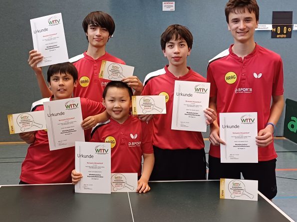 Auch bei den Jungen 15 setzte sich Borussia Düsseldorf durch – diesmal in der Aufstellung Victor Voigt, Dorian Lheriau, Avelino Zhang, Carlo Birkenkamp und Lukas He. Der Weg zum Titel war allerdings etwas steiniger. Im Auftaktspiel gegen die HSG Siebengebirge-Thomasberg wurde es um 10 Uhr direkt spannend. Bis zum 4:4 verlief die Partie völlig ausgeglichen, ehe Avelino Zhang und Carlo Birkenkamp mit zwei starken Siegen den 6:4-Endstand sicherten. Gegen den TTC SW Nievenheim wurde es dann deutlicher: Borussia gewann mit 6:2. Im letzten Spiel gegen den TuS Hiltrup ließ Borussia nichts anbrennen und siegte mit 6:2 – auch hier eine starke Teamleistung, die mit dem Titel belohnt wurde.