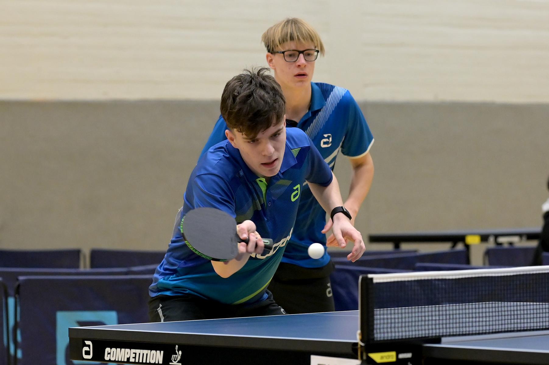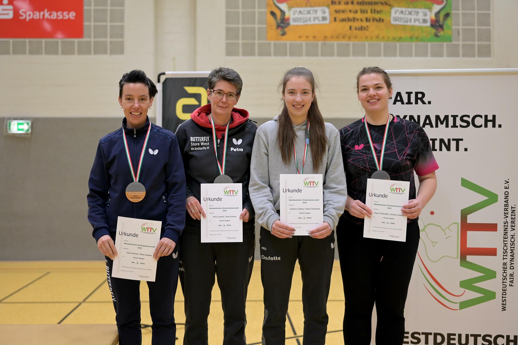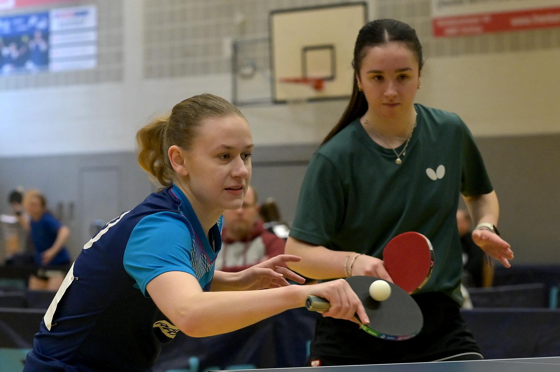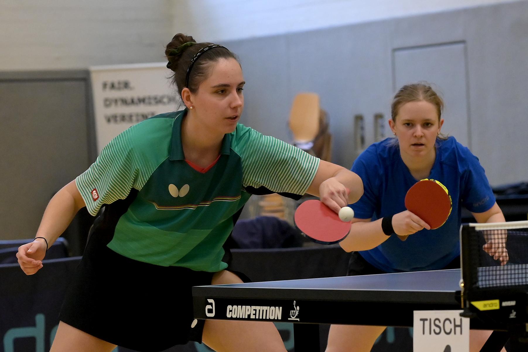 In den Doppel-Finals standen sich bei den Herren Verdonschot/Qiu und Hersel/Andersen gegenüber Bei den Damen trafen Kalaitzidou/Düchting (6:1 in der 2. Bundesliga) auf H. Schönau/Hoffmann (2:1 in der 3. Bundesliga Nord). Die Links-/Rechts-Kombination aus Holzbüttgen traf auf eines der besten Doppel der 2. Damen-Bundesliga. Zur Überraschung aller Experten setzten sich die Drittligakombination vollauf verdient mit 3:1 durch. Nach verlorenem ersten Satz liefen Schönau/Hoffmann regelrecht heiß. Kaum leichte Fehler, aggressive Angriffsbälle und zwei sichtlich beeindruckte Gegnerinnen brachten ihnen den Titel. Stephanie Hoffmann war überglücklich; „Wir spielen ja auch in der Meisterschaft gut zusammen. Hannah war in den Rückschlägen richtig stark. Ich konnte in den Rallyes immer wieder gut punkten. Links-rechts war in dieser Konstellation sicherlich ein Vorteil.“