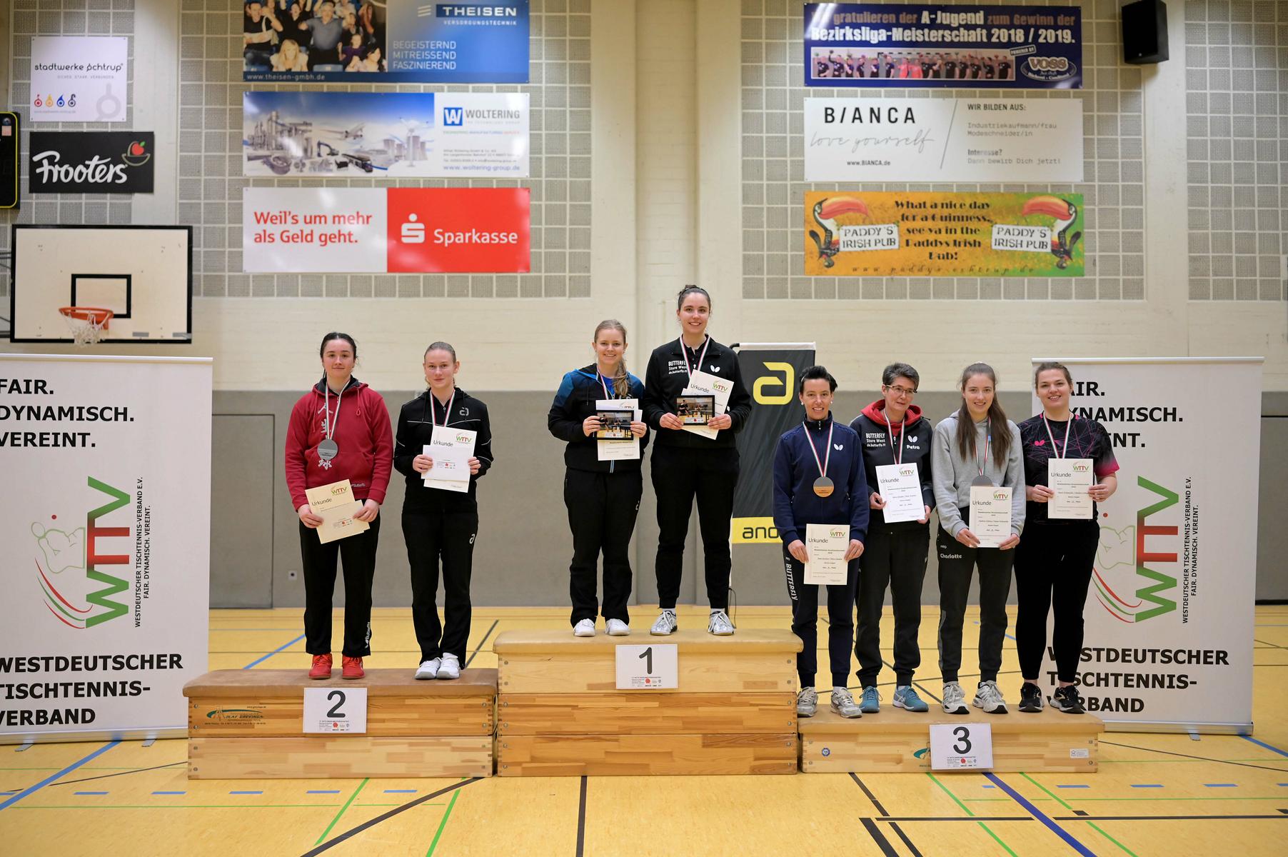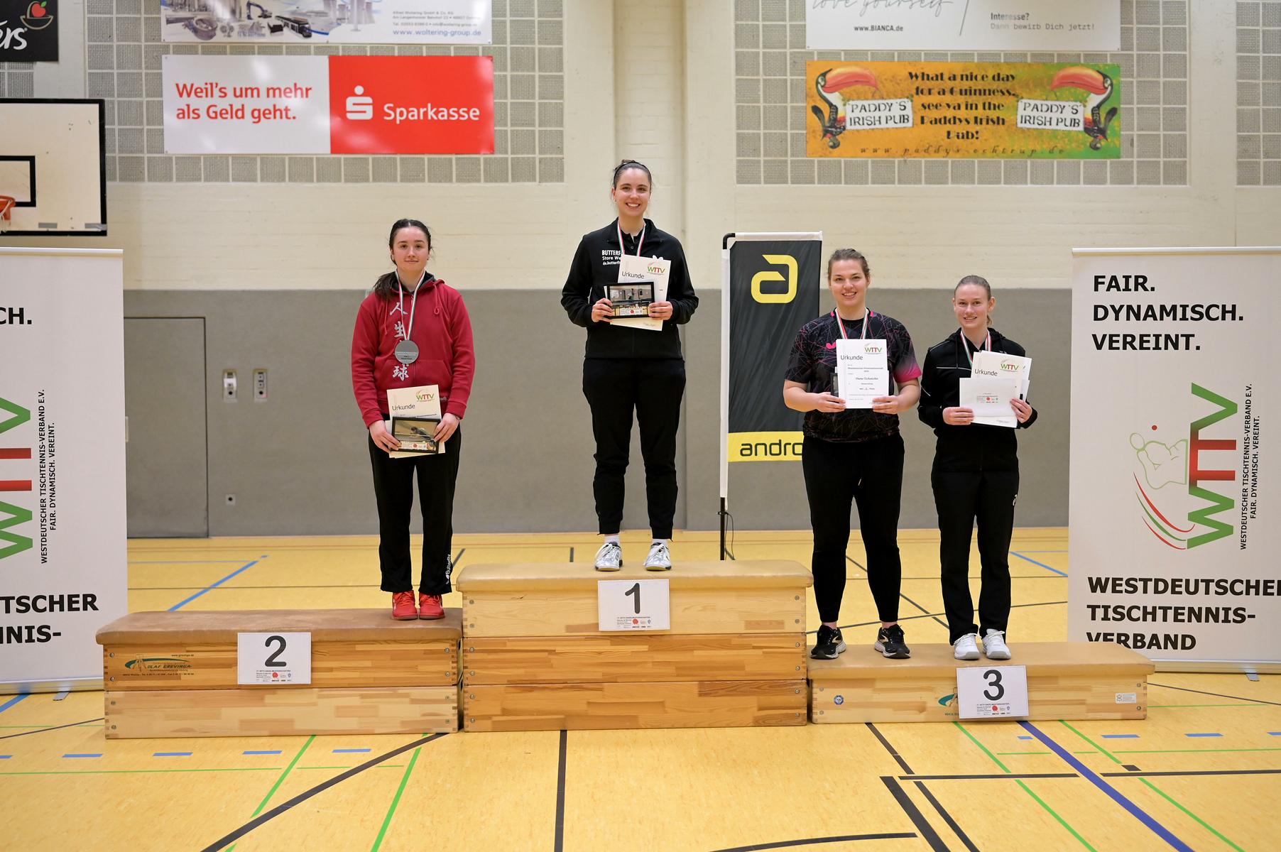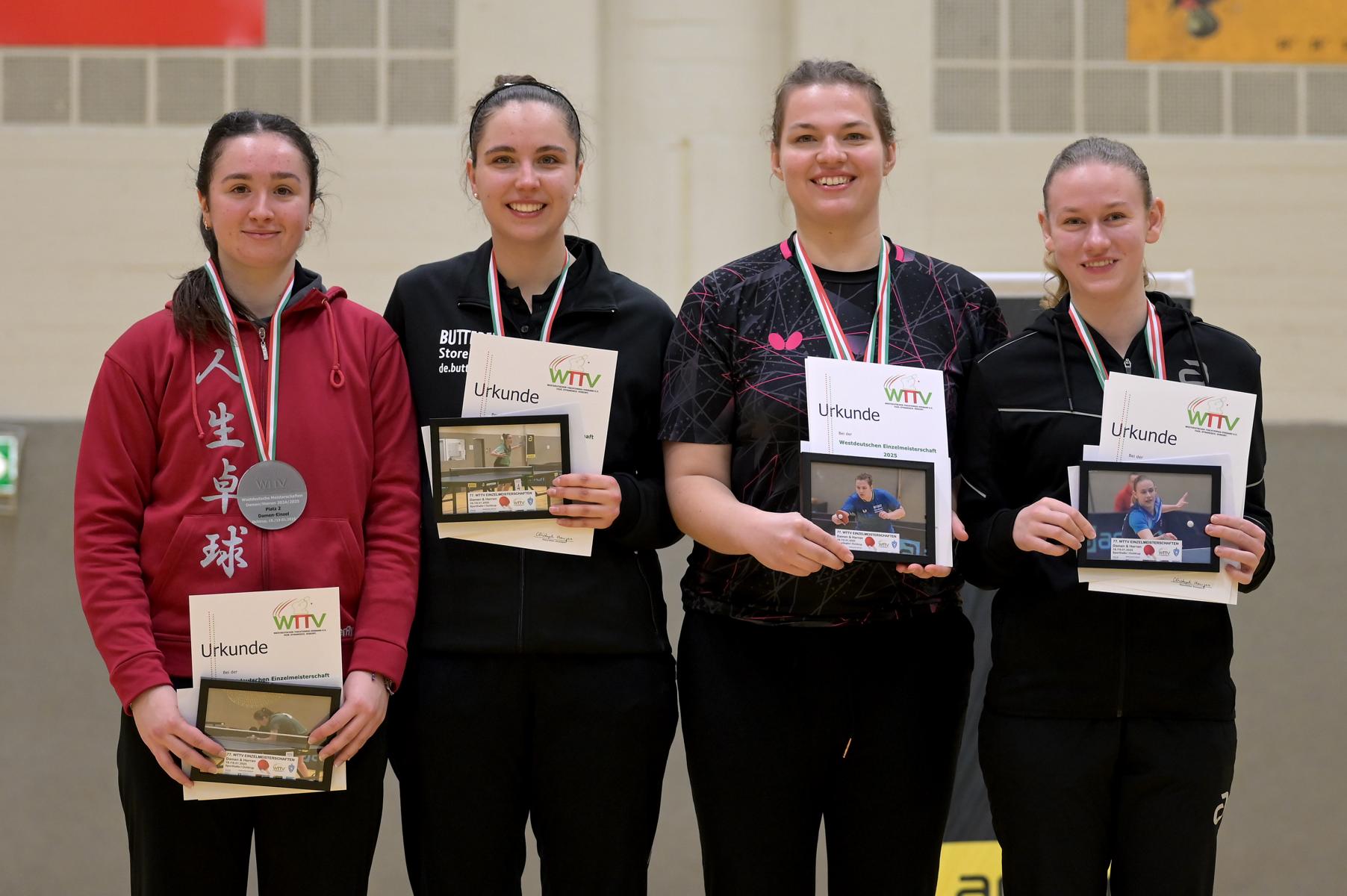 Mit den Viertelfinalspielen im Damen-Einzel starteten die Westdeutschen Meisterschaften in ihren zweiten Tag. Top-Favoritin Kalaitzidou ließ Charlotte Schönau beim 4:0 keine Chance. Enger wurde es in den übrigen Spielen. Hannah Schönau besiegte nach zwei umkämpften ersten Sätzen Ruoqi Wei mit 4:1. Die 17-jährige Luisa Düchting musste sich mit der erfahrenen Anne Sewöster auseinandersetzen. Zweimal vergab Düchting klare Führungen und ließ Sewöster damit im Spiel. Doch beim Stande von 2:2 spielte sie endlich konstanter und siegte verdient mit 4:2. Das Spiel Hoffmann gegen Tschunichin ging in den Entscheidungssatz, in dem sich mit Tschunichinn, die Außenseiterin aus Münster, etwas überraschend durchsetzen konnte.