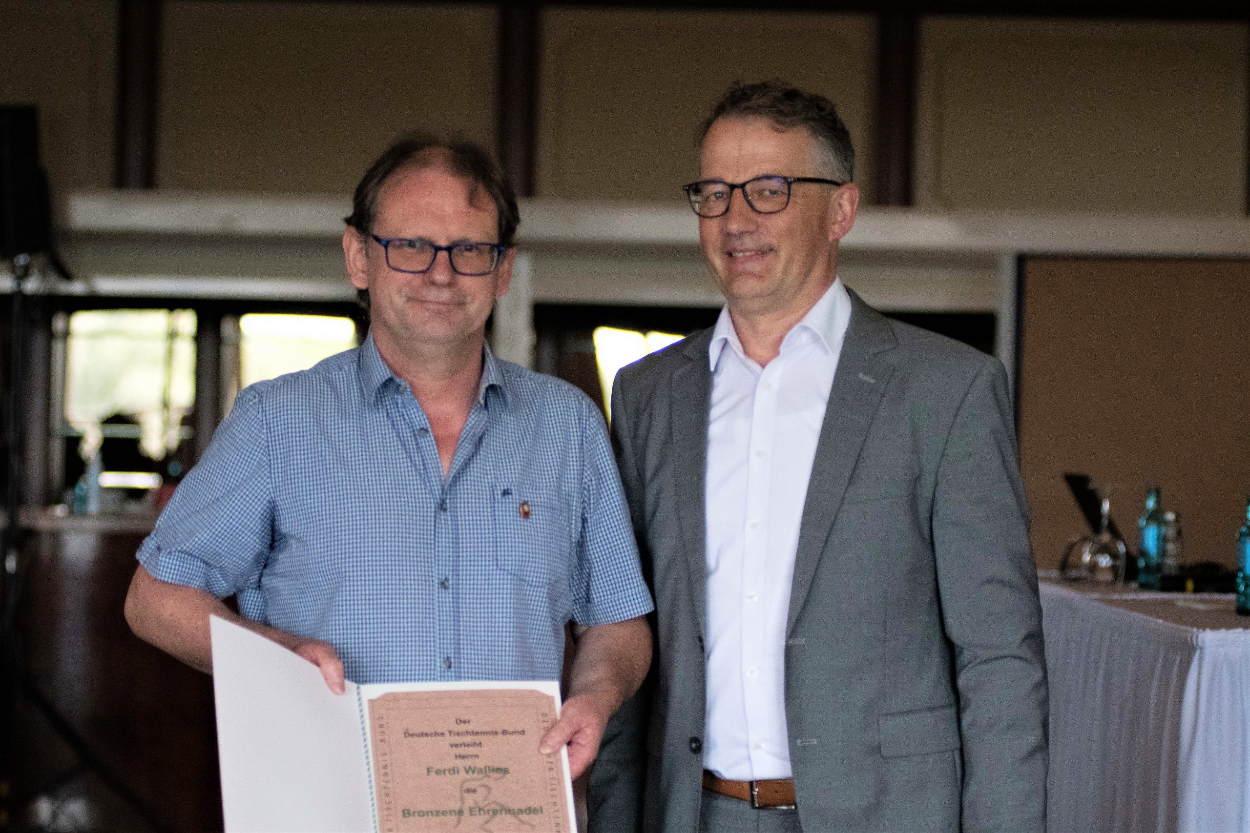 Eine zweifache Ehrung stand danach auf dem Programm: Für seine Verdienste wurde Ferdi Wallies (Stolberg) nicht nur mit der Ehrenplakette des WTTV ausgezeichnet, denn DTTB-Präsident Michael Geiger verlieh dem Vorsitzenden des Bezirkes Mittelrhein im Anschluss zusätzlich die Ehrennadel des DTTB in Bronze.
